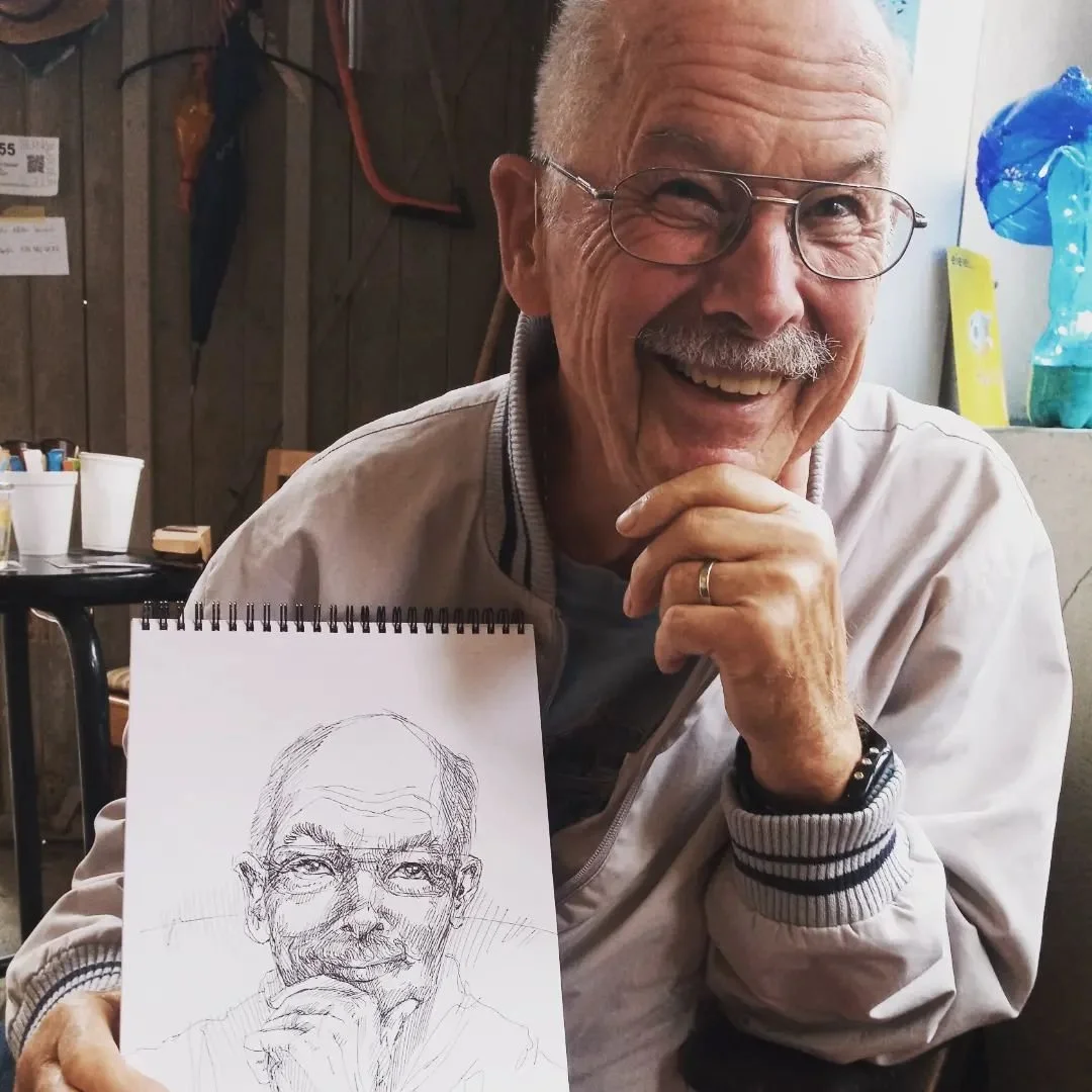 A lively, expressionistic ink sketch on archival paper